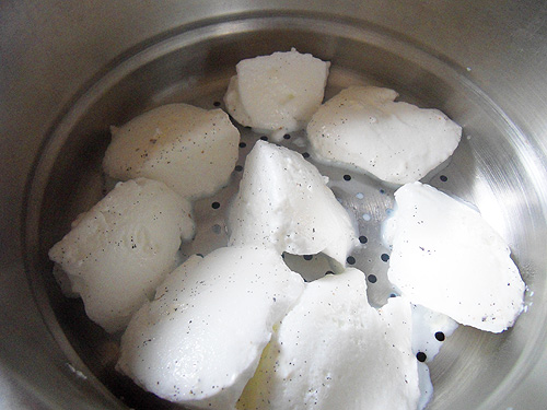 A tejet vastag aljú teflonedénybe öntöm. A vaníliarudat felhasítom, a magokat belekaparom a tejbe és a héjat is beleteszem. Felteszem melegíteni, ügyelve, hogy ne forrjon fel, épp csak a forráspont közelében legyen mindig. (Ha mégis megforrt, akkor le kell húzni, és várni kell, míg egy kissé lehűl.)A bőrt leszedem a tetejéről.